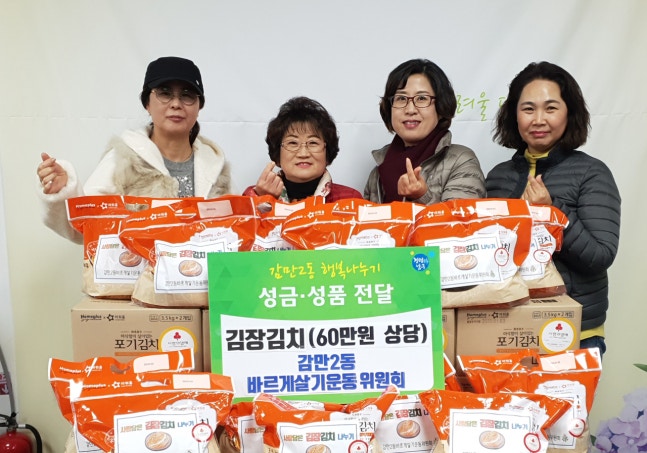 ºÎ»ê ³²±¸ °¨¸¸2µ¿ ¹Ù¸£°Ô»ì±âÀ§¿øÈ¸(À§¿øÀå ÀÓÁ¤ºÐ)´Â 13ÀÏ ¼Ò¿ÜµÈ ÀÌ¿ô¿¡ ±èÀå±èÄ¡¸¦ ³ª´©´Â '»ç¶ûÀÇ ±èÀå±èÄ¡ ³ª´©±â'Çà»ç¸¦ °¡Á® Àú¼ÒµæÃþ 37¼¼´ë¿¡ ±èÄ¡(60¸¸¿ø »ó´ç)¸¦ Àü´ÞÇÏ°í ¾ÈºÎ¸¦ ¹°¾ú´Ù.