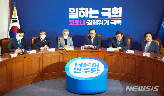 [서울=뉴시스]김선웅 기자 = 이해찬 더불어민주당 대표가 18일 오후 서울 여의도 국회에서 북한의 개성공단 남북연락사무소 폭파와 관련해 열린 더불어민주당 외교안보통일자문회의에서 발언을 하고 있다. 2020.06.18.